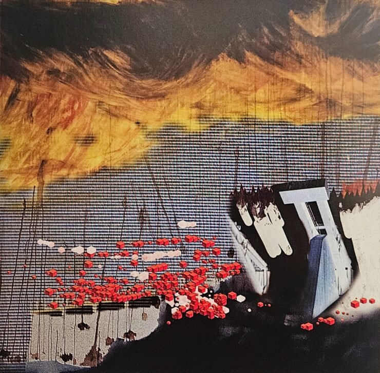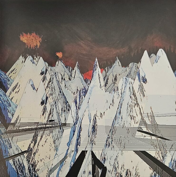 He eventually started using knives and sticks in his process, adding a more urgent dimension to his art. The painting were apocalyptic, with red skies, white fields, weird creatures… At some point Donwood decided to stop painting and take pictures of the paintings. Nigel Godrich, Radiohead’s longtime producer, discovered a piece of software that could convert digital pictures into gradient 3D landscapes. It would render bright parts like mountains and dark colours as deep valleys… Yorke and Donwood began exploring these rendered terrains, combining them with the original paintings. Then they reworked the results both digitally and by hand. Some odd landscape with frozen mountains, dark red skies, and more odd creatures or pools of blood starting to take shape.