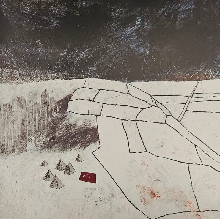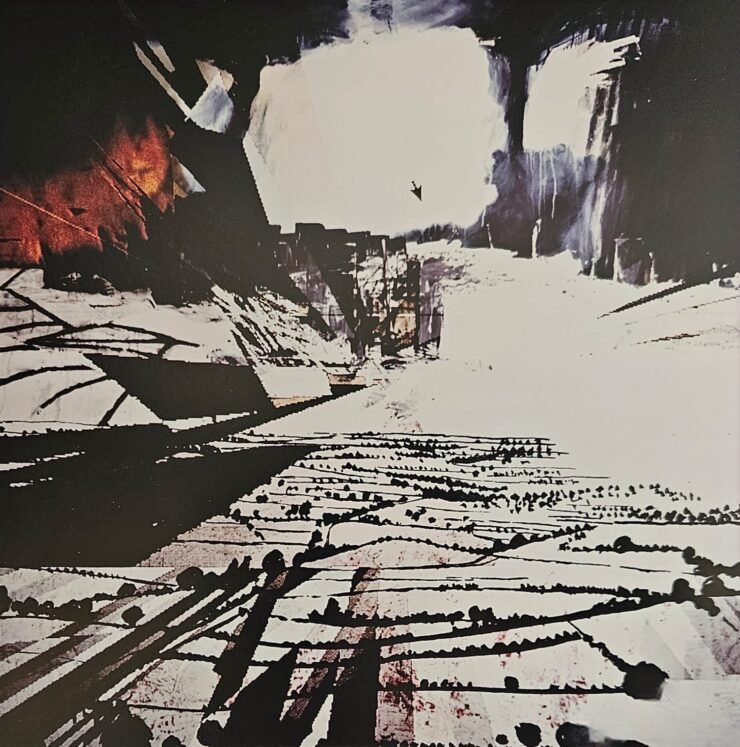 The snow especially haunted him. « Snow showed every mark, every defilement, every drop of blood spilt, each single act of barbarity; all was laid bare, impossible to deny ». He started using putty with his painting and cover entire areas with it. When dried, he would then be able to smear soot over it, stain it with oil or blood —aka red paint. This coincided with Radiohead going back in studios. Donwood moved all his paintings in a barn next door to the barn Radiohead had rehabilitated as a recording studio in Oxfordshire. There he was able to mess around with Thom Yorke —aka Tchock for his design work— painting and feeding off each other’s work (visual, musical or writing)…