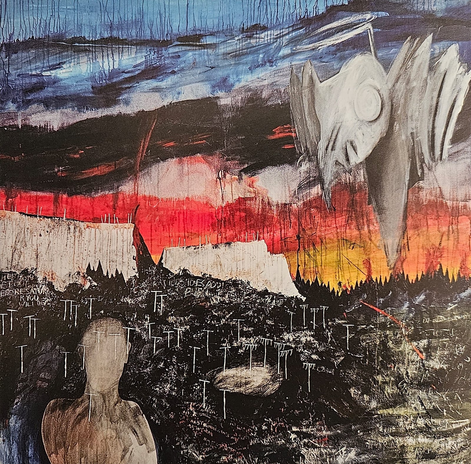 The snow especially haunted him. « Snow showed every mark, every defilement, every drop of blood spilt, each single act of barbarity; all was laid bare, impossible to deny ». He started using putty with his painting and cover entire areas with it. When dried, he would then be able to smear soot over it, stain it with oil or blood —aka red paint. This coincided with Radiohead going back in studios. Donwood moved all his paintings in a barn next door to the barn Radiohead had rehabilitated as a recording studio in Oxfordshire. There he was able to mess around with Thom Yorke —aka Tchock for his design work— painting and feeding off each other’s work (visual, musical or writing)…