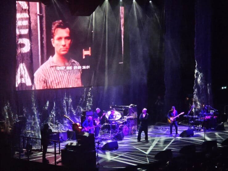 Then, as an American flag rotated vertically, transforming into prison bars over a looped clip of James Baldwin, Morrissey and his band entered the stage.